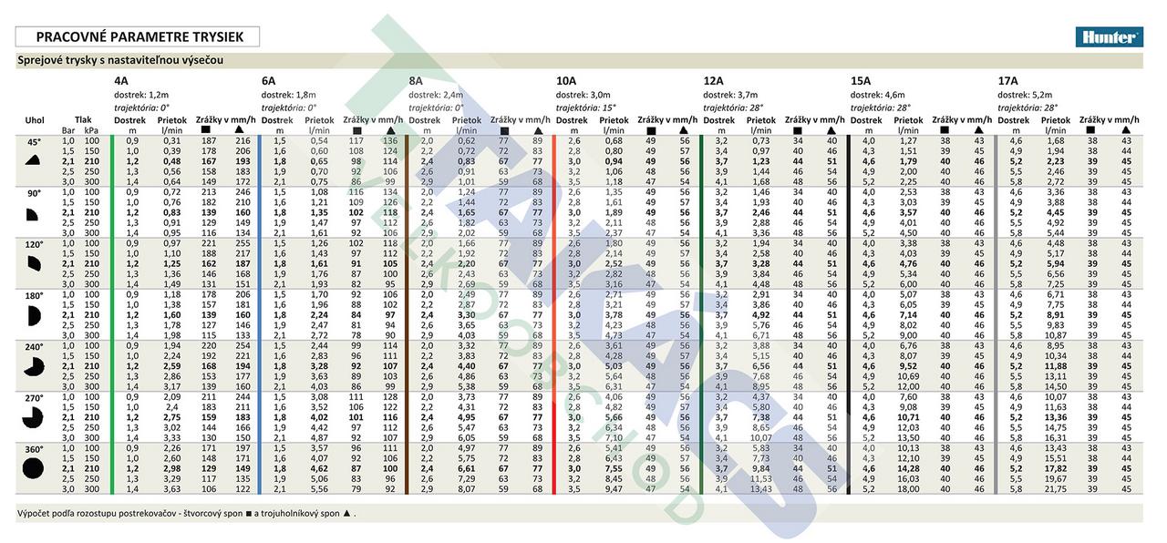Pracovné parametre trysiek Hunter Pro Adjustable Nozzles